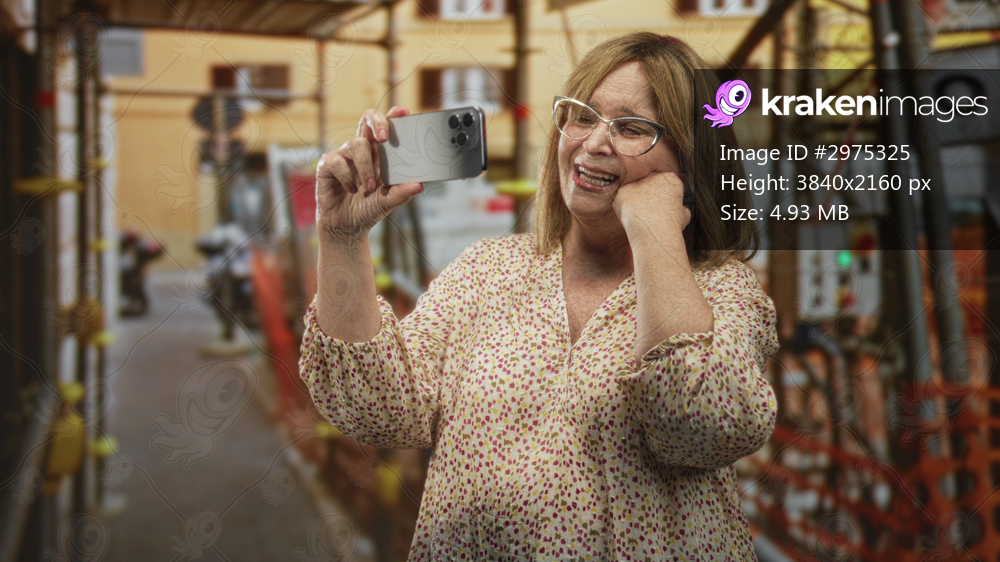 Middle age woman holding smartphone for a selfie, hand on cheek, smiling on a street with scaffolding; joy.