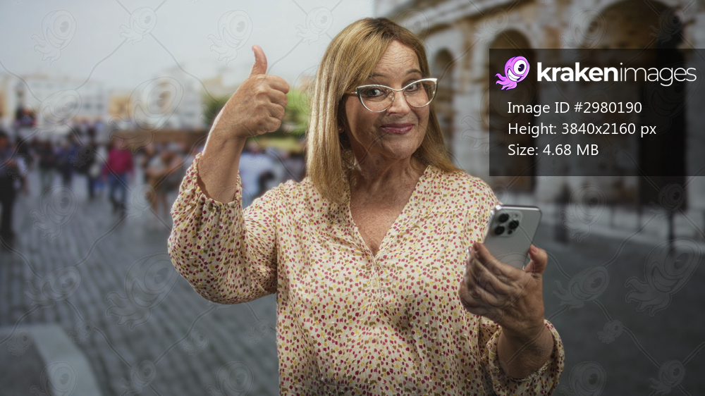 Middle age woman holding smartphone and showing thumbs up on cobblestone street near ancient stone arches; confidence travel.