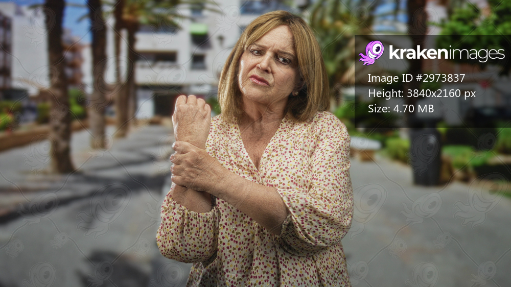 Middle age woman holding wrist on sunny urban street promenade near palm trees, bench and buildings; physical discomfort.