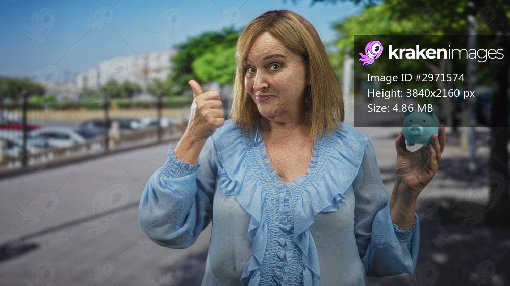 Middle age woman holds blue piggy bank in hand and raises fist on street; confidence savings security.