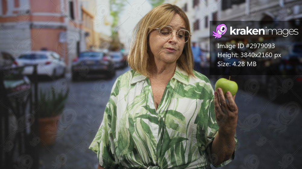 Middle age woman holds green apple in right hand on street, wearing patterned blouse and glasses; quiet contemplation.