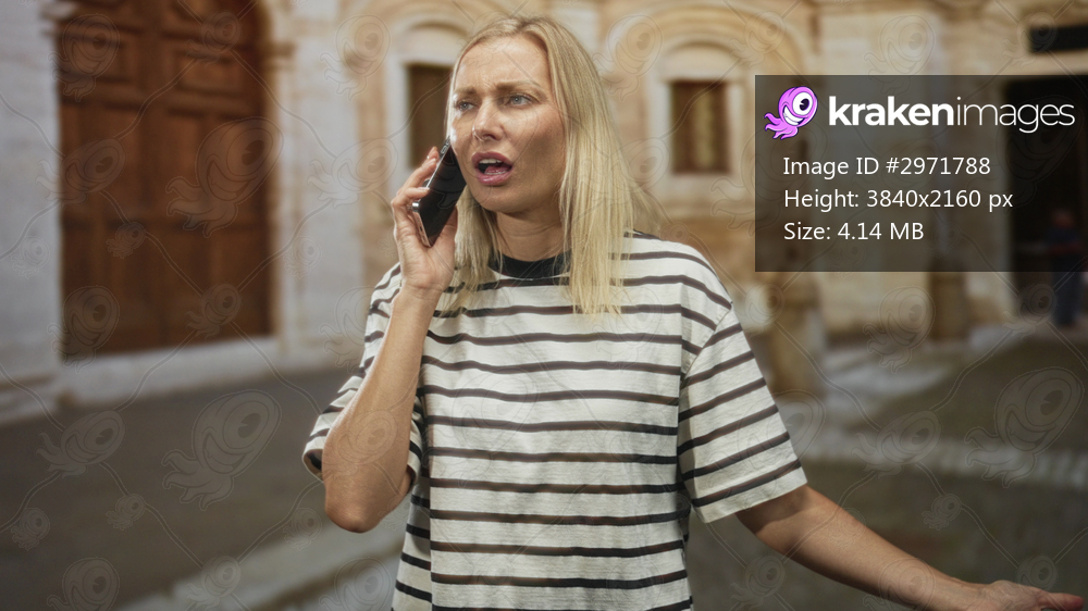 Middle age woman holds smartphone at arm and shrugs with puzzled face in front of stone building; confusion misunderstanding.