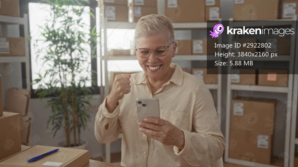 Middle age woman holds smartphone and pumps fist amid parcel shelves in building storage room; small business celebration.