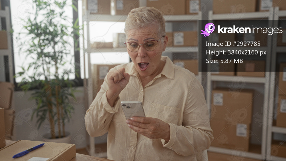 Middle age woman holds smartphone and pumps fist amid parcel shelves in building storage room; small business celebration.