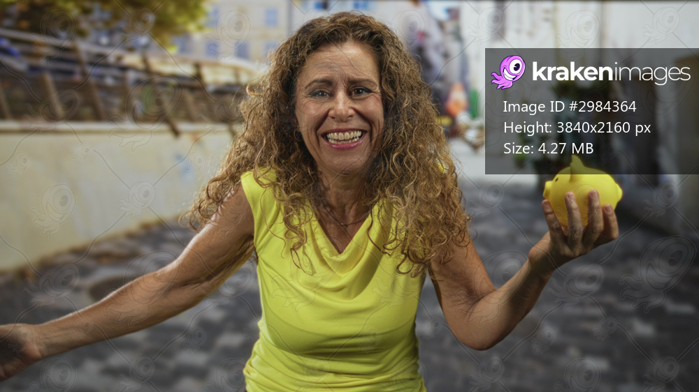 Middle age woman holds yellow piggy bank in right hand and shrugs left arm on a sunlit cobblestone street, smiling broadly; joy retirement savings.