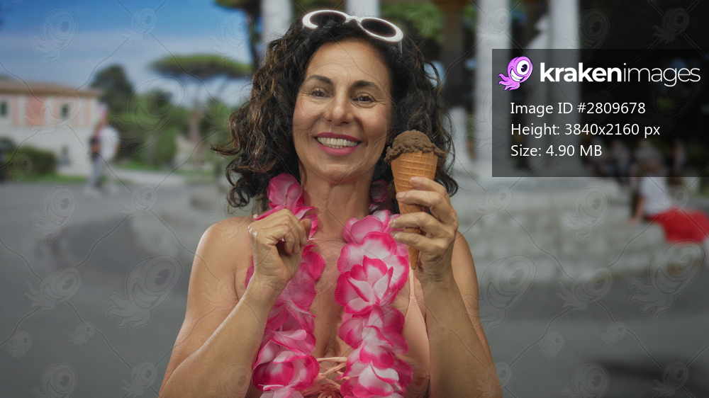 Middle age woman in bikini wearing lei hand shows ok sign while holding ice cream cone in plaza; approval fun.