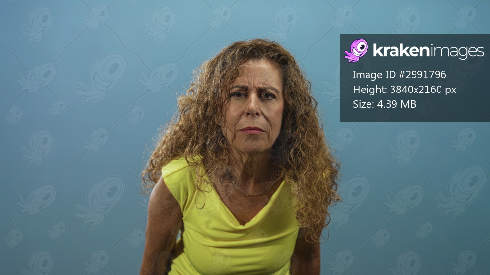 Middle age woman in yellow sleeveless top leans forward toward camera, frowning with furrowed brow, necklace visible and bare shoulders against studio blue backdrop; concern. - Kraken Images
