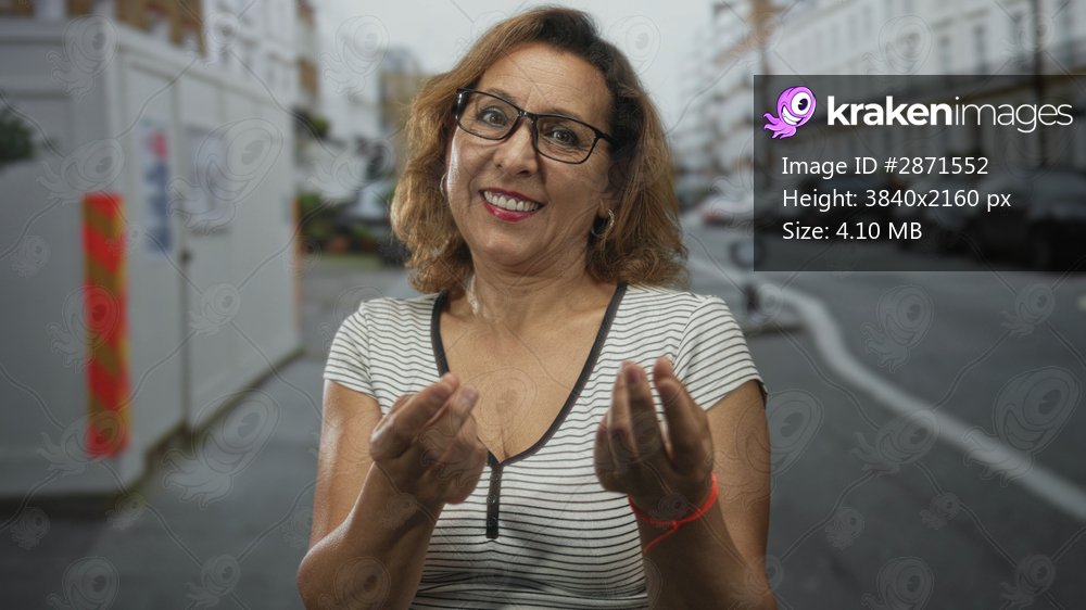Middle age woman makes money gesture with both hands on city street, smiling directly at camera; playful invitation.