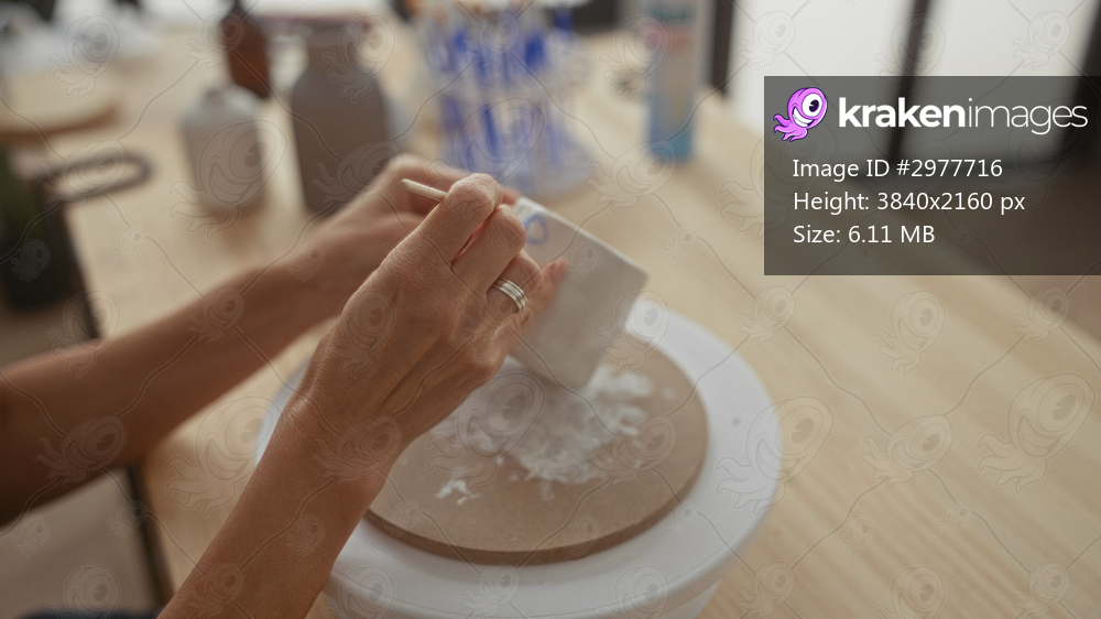 Middle age woman paints glaze on a white ceramic mug with steady hands on a rotating turntable in a pottery studio; concentration.
