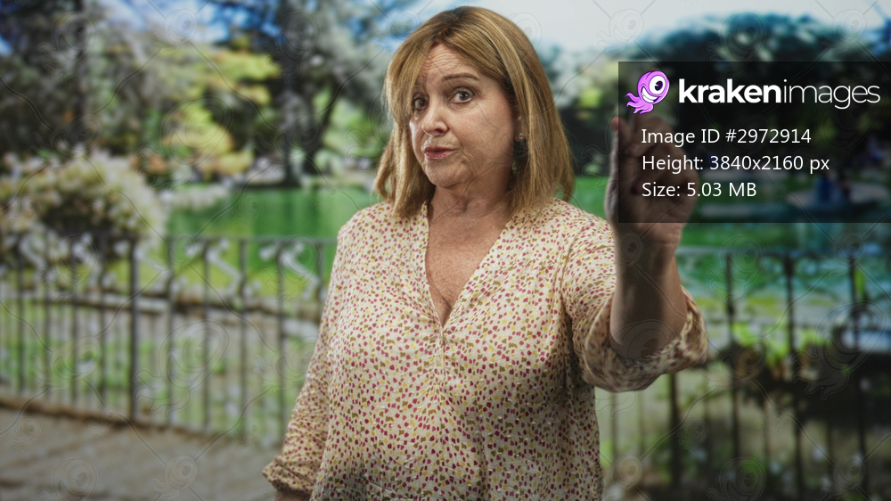 Middle age woman pointing finger forward with bare hand toward camera by park lake railing, floral blouse, serious expression; assertive.