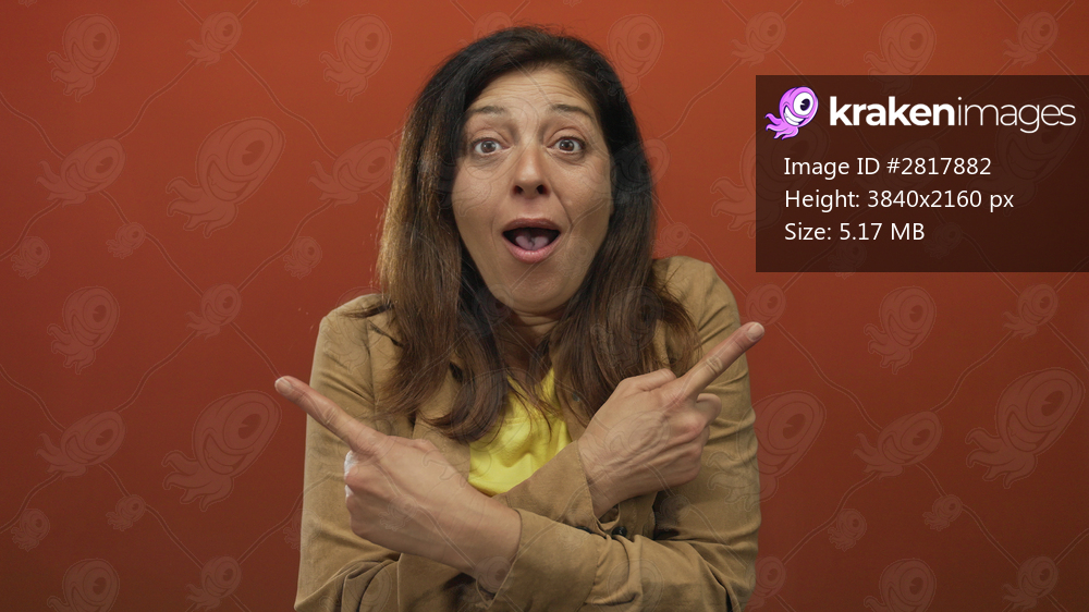 Middle age woman pointing finger to object while glancing sideways in an orange studio room that highlights her hand gesture; confusion.