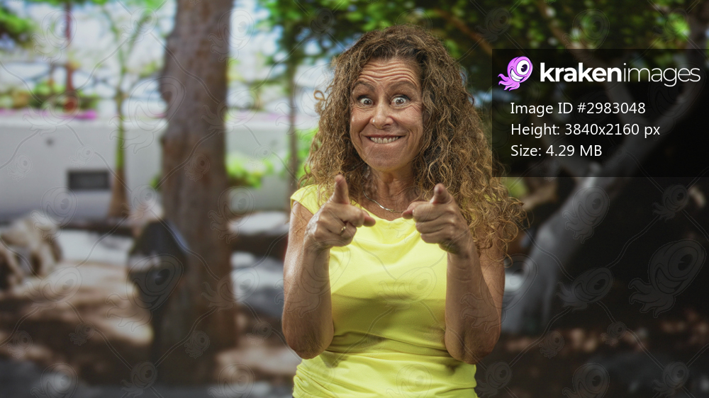 Middle age woman points fingers at camera in building courtyard wearing yellow top with shocked open mouth and curly hair; surprise humor.