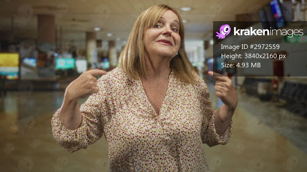 Middle age woman points fingers to chest in an airport baggage claim terminal while wearing a patterned blouse; confusion.
