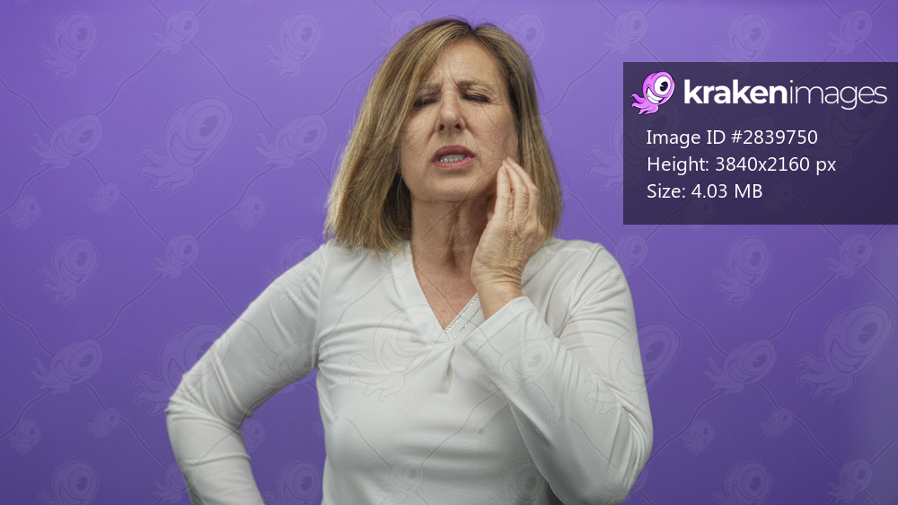Middle age woman pressing cheek with hand and frowning in purple studio portrait; toothache discomfort.