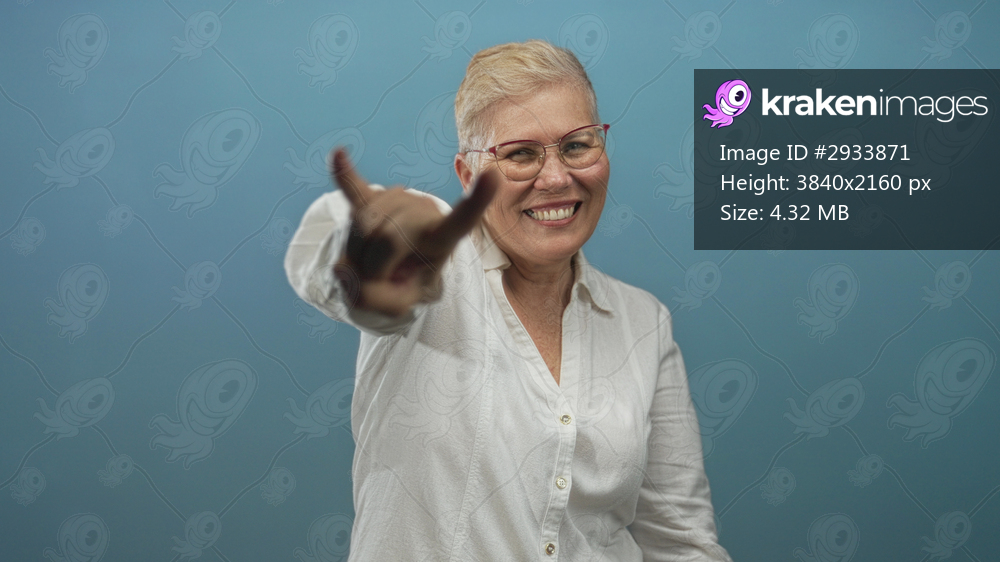 Middle age woman with short blonde hair and glasses in a white shirt making rock horns hand gesture in studio against a blue backdrop, smiling; joy confidence. - Kraken Images