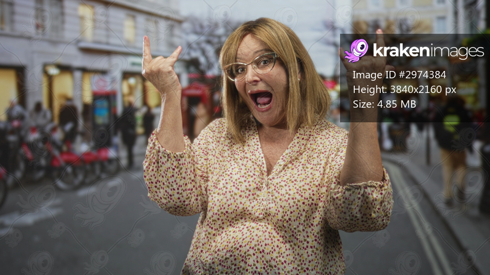 Middle age woman showing tongue and rock horns gesture on street, wearing glasses and floral blouse; playful rebellion carefree joy.