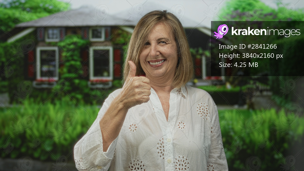 Middle age woman shows thumb up gesture at building entrance outdoors near green hedge and window shutters; confidence.