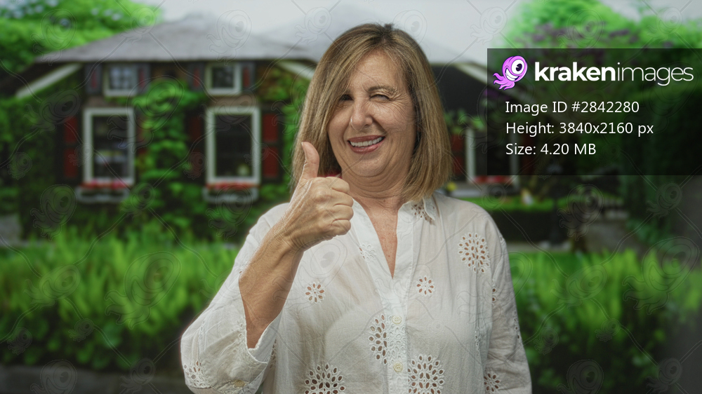 Middle age woman shows thumb up gesture at building entrance outdoors near green hedge and window shutters; confidence.