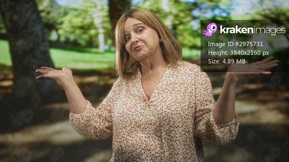 Middle age woman shrugs with palms up, hands visible and raised shoulders in a forest clearing wearing a floral blouse and small earring facing camera in soft sunlight; uncertainty. - Kraken Images