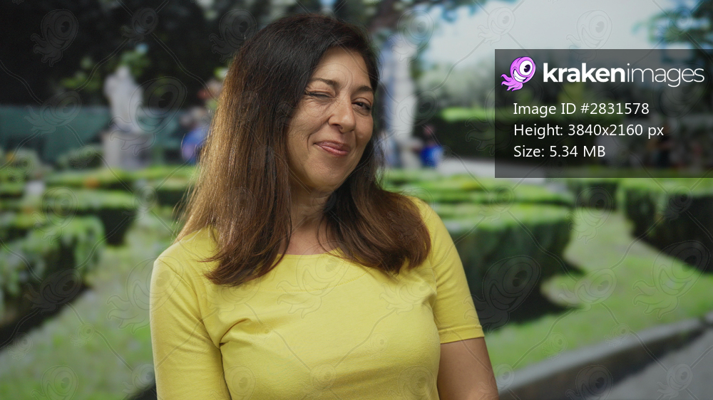 Middle age woman smiling beside manicured hedges in a green park under sunlight near stone statue; serenity calm joy peace.