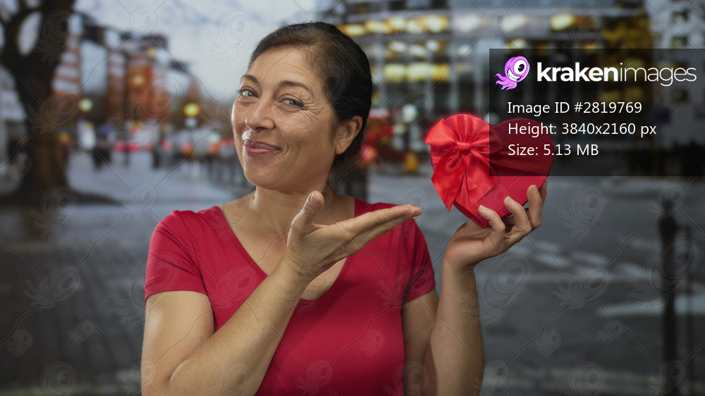 Middle age woman smiling and holding heart shaped gift box while pointing hand in street; love joy affection.