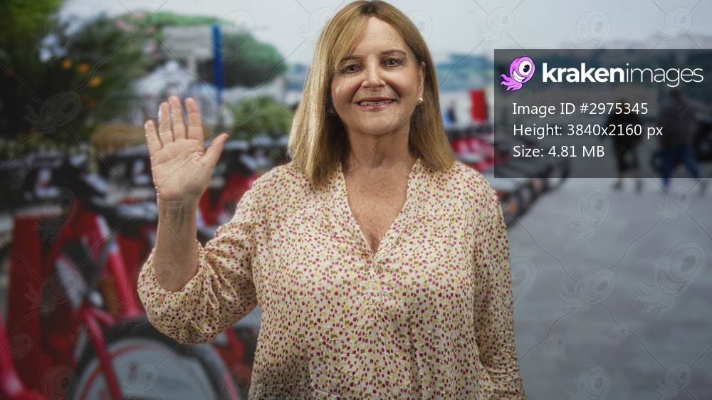 Middle age woman smiling and waving right hand with palm visible beside a row of rental bikes near a busy city street; warmth welcome.