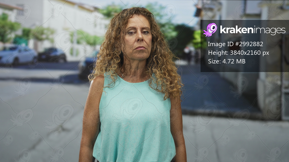 Middle age woman standing with eyes closed, exposed face and curly hair wearing a turquoise sleeveless top on a residential street; quiet contemplation. - Kraken Images