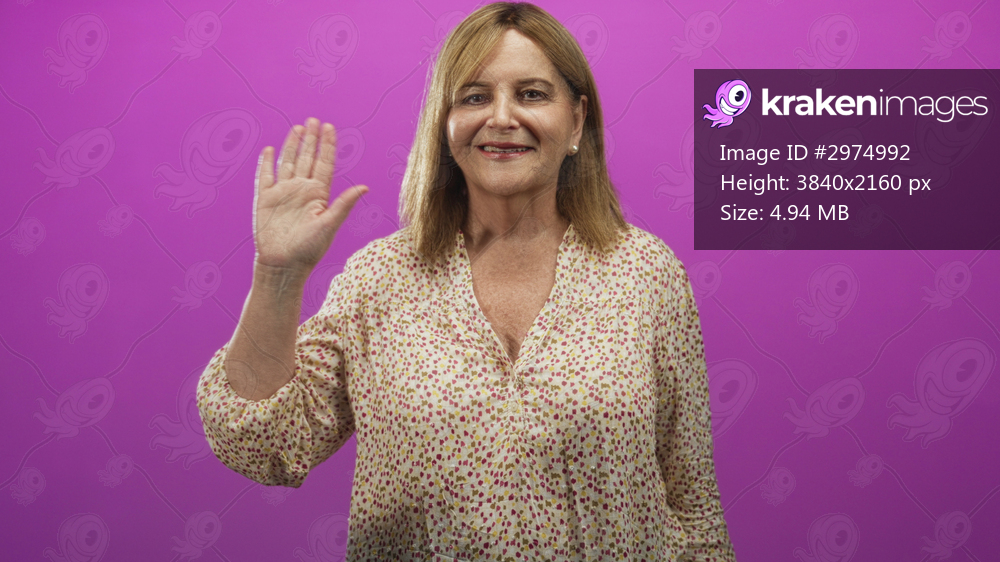 Middle age woman waves right hand and smiles in studio with pink backdrop wearing floral blouse and pearl earring; friendly greeting.