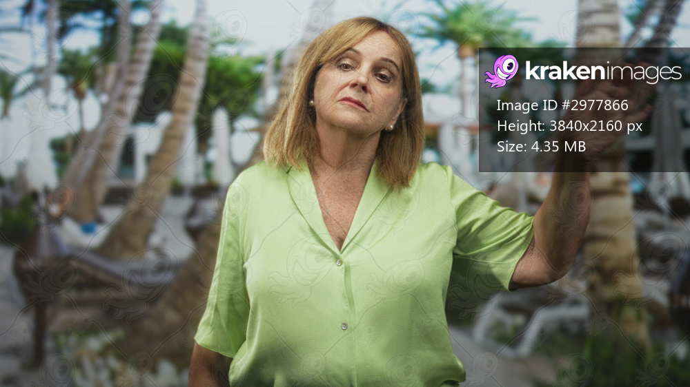 Middle age woman waving hand by palm trees and lounger wearing green blouse in studio; resignation fatigue.
