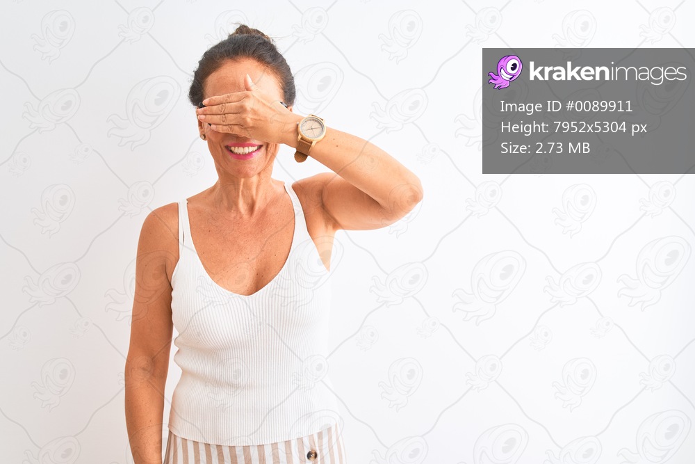 Middle age woman wearing casual t-shirt and glasses standing over isolated white background smiling and laughing with hand on face covering eyes for surprise. Blind concept. - Kraken Images