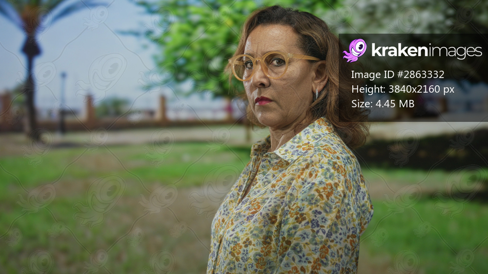 Middle age woman wearing floral shirt profile face gazing toward tree line in green park; quiet contemplation.