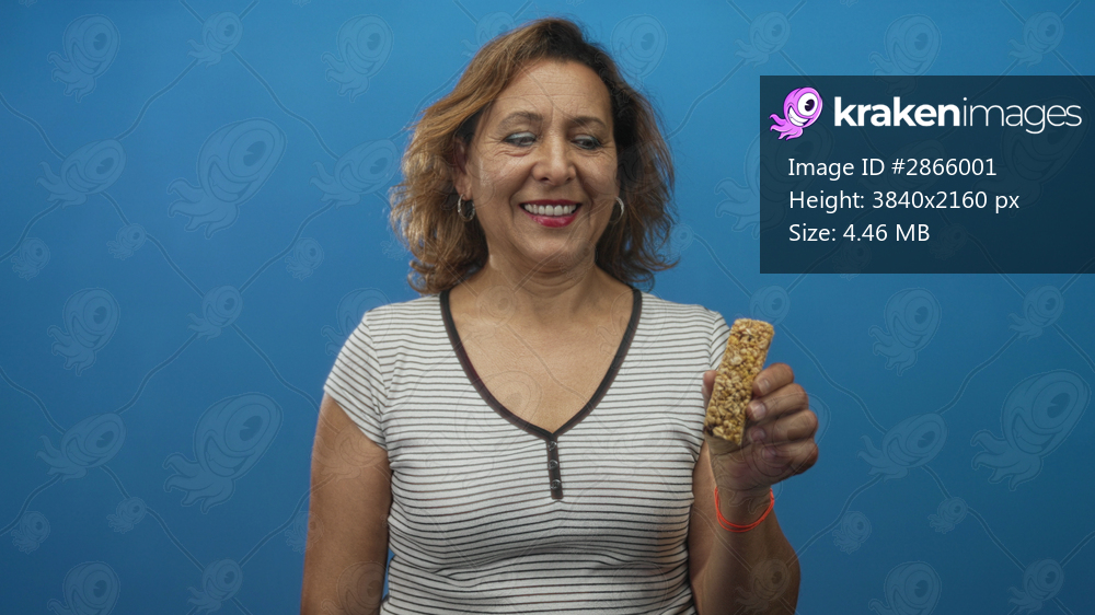 Middle age woman wearing striped shirt smiling and holding granola bar with hand in bright blue studio; happiness.