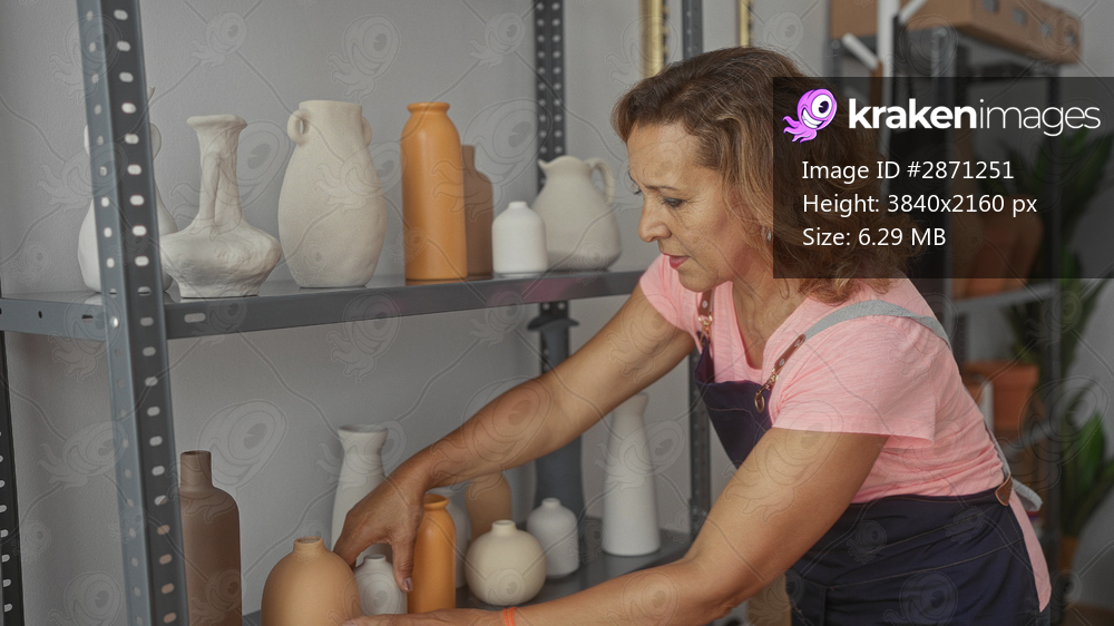 Middle aged artisan woman reaches for a ceramic vase displayed on a metal shelf in an indoor art studio; quiet dedication.