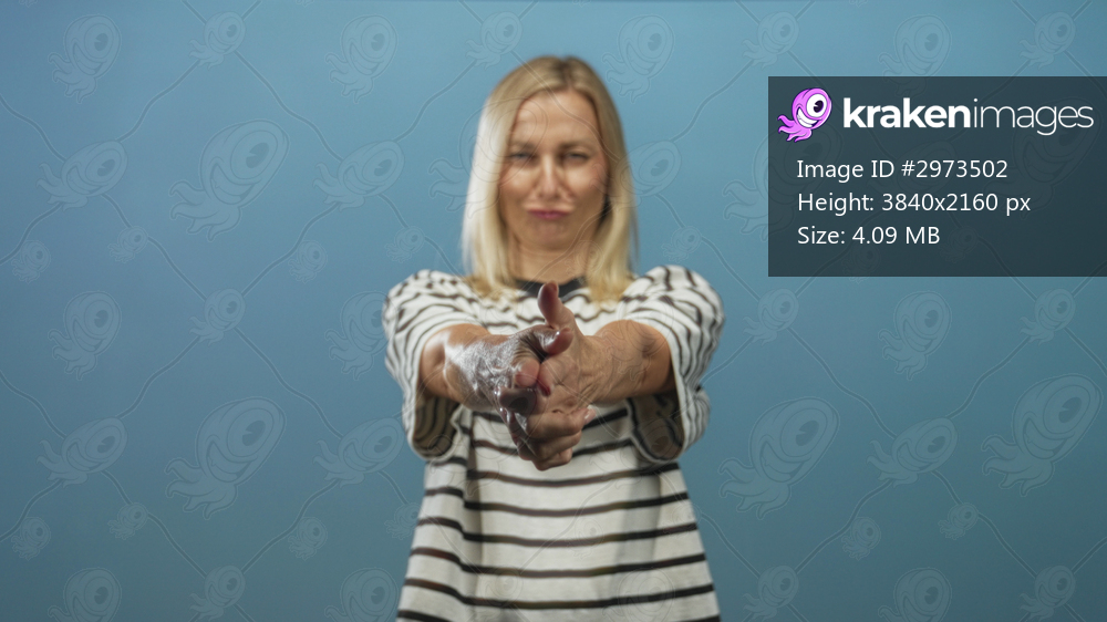 Middle aged blonde woman with dark wet substance on hands making a finger gun pointing gesture in studio; playfulness mischief.