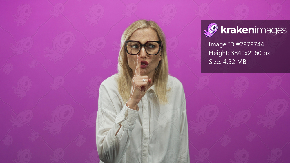 Middle aged blonde woman with glasses and finger to lips shushing for silence in studio with pink backdrop; silence secrecy.