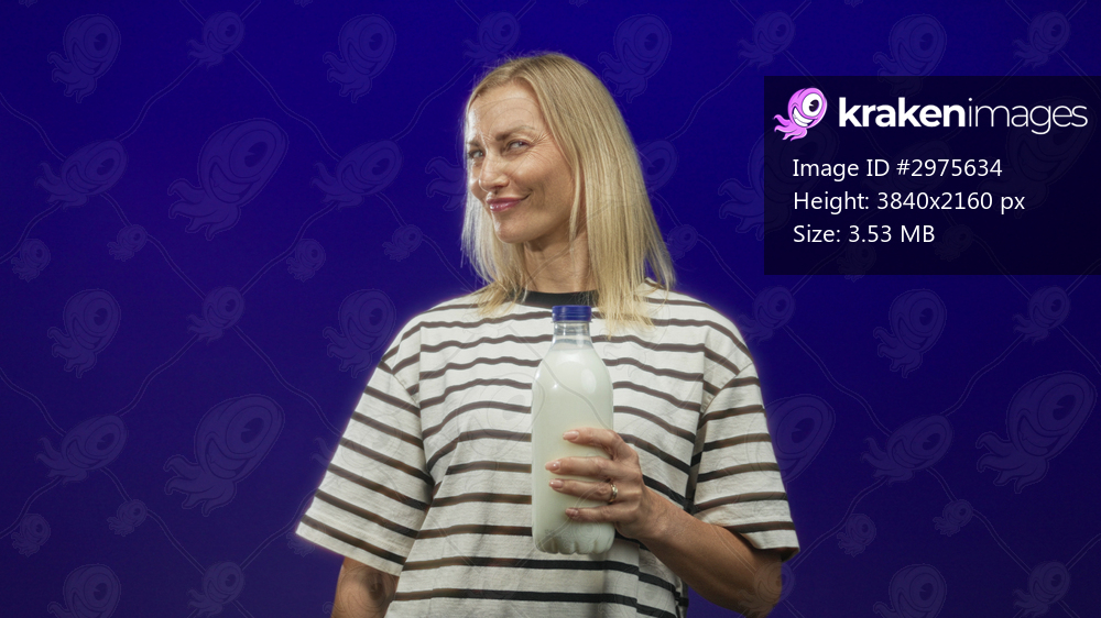 Middle aged blonde woman holding a milk bottle with fingers on the cap, smirking in studio; wry amusement.