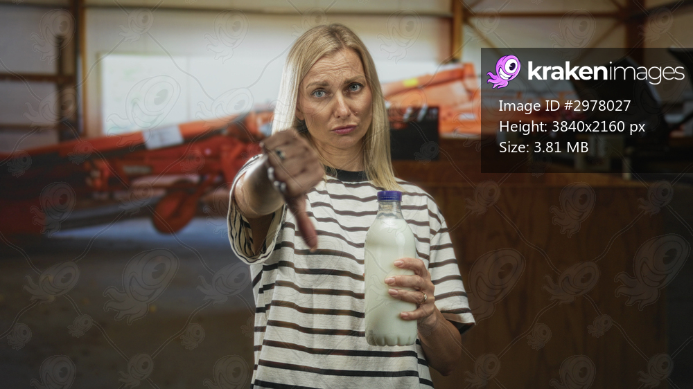 Middle aged blonde woman holds a milk bottle and gives a thumbs down with her hand toward camera inside a storage building with machinery visible; disapproval food safety. - Kraken Images