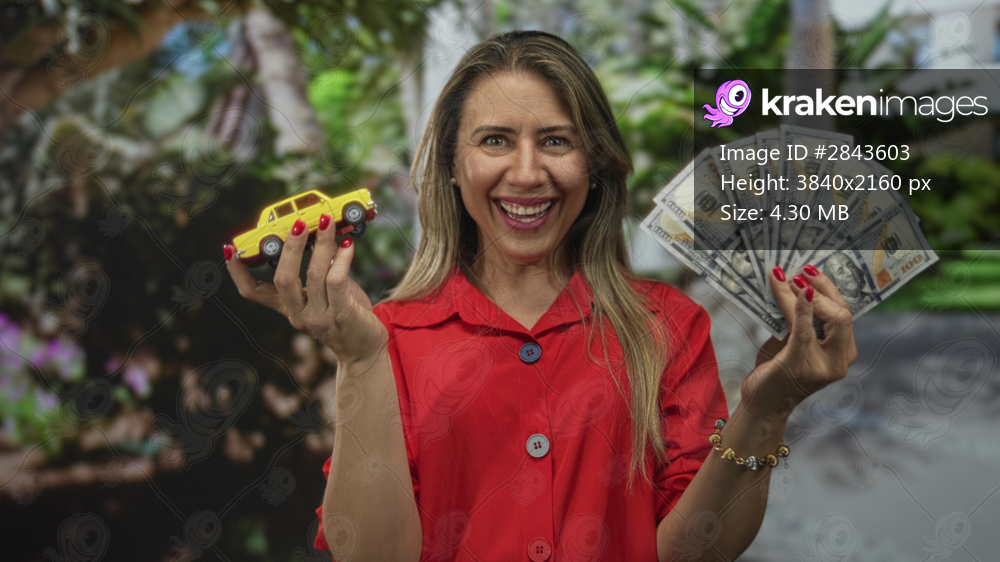 Middle aged blonde woman holds yellow toy car with right hand and displays fanned dollar bills in park; financial freedom.