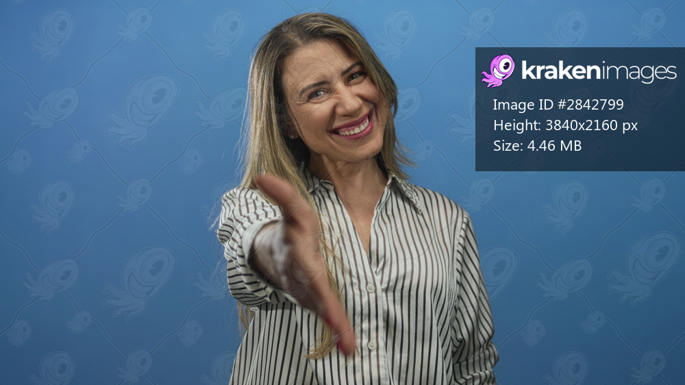 Middle aged blonde woman in striped shirt extends hand for handshake in blue studio setting; warm welcome.