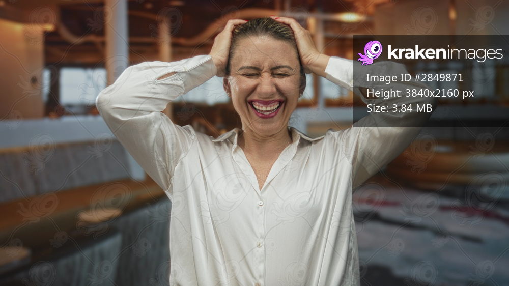 Middle aged blonde woman in white shirt clutching head and smiling inside restaurant building; excitement.