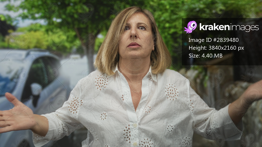 Middle aged blonde woman in white shirt waving hand on street during daylight with open mouth; surprise.