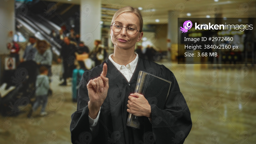 Middle aged blonde woman judge in robe points finger while holding law book in busy airport terminal; authority resolve.