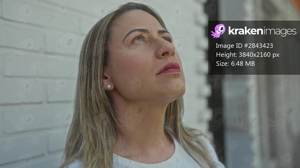 Middle aged blonde woman tilts head upward next to white brick building on street; quiet contemplation.