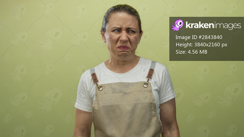 Middle aged blonde woman wearing apron with wrinkled nose grimacing in green studio setting; disgust.
