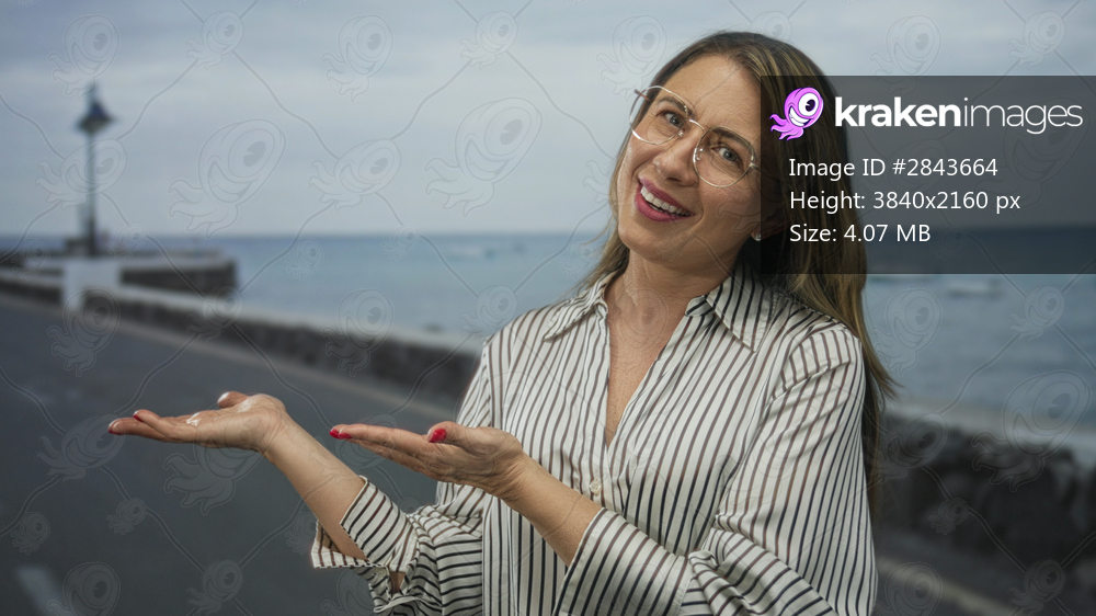 Middle aged blonde woman wearing striped shirt and glasses holds open palms on seaside street; warmth welcome happiness.