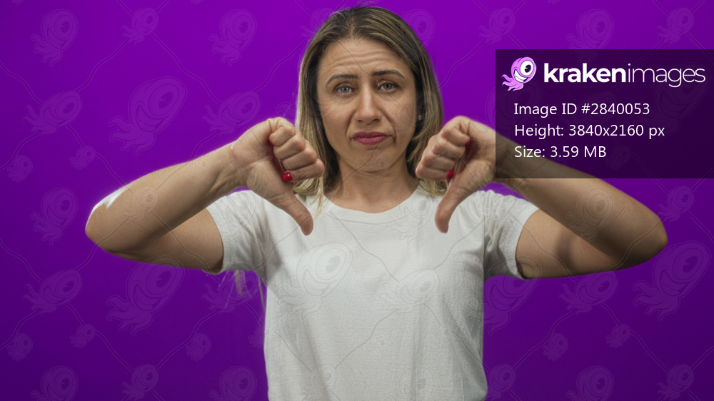 Middle aged blonde woman wearing white t shirt showing thumbs down gesture in purple studio; rejection.