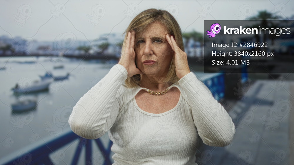 Middle aged caucasian woman holds head with both hands on street promenade by the sea; pain headache.