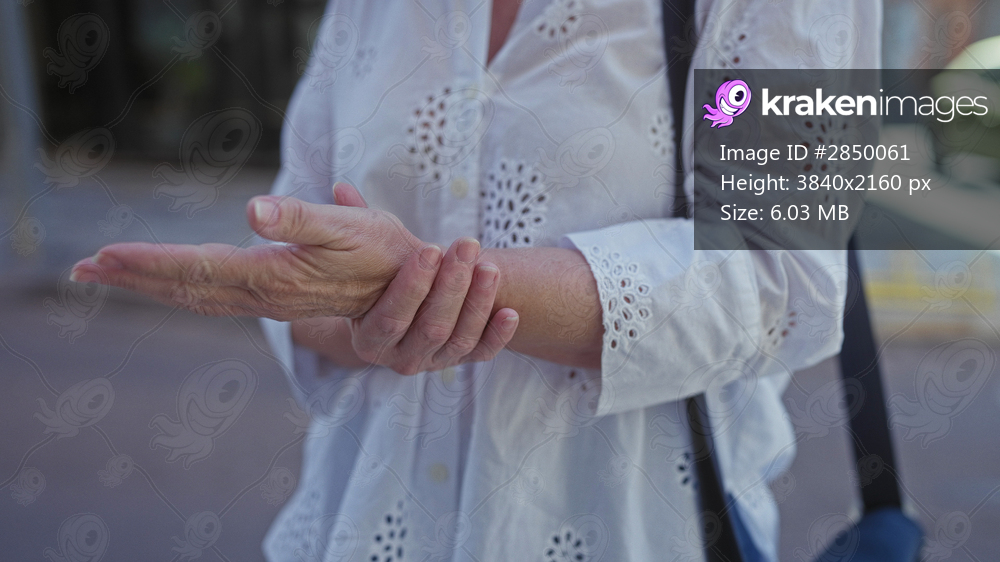 Middle aged caucasian woman in white blouse holds her aching wrist on busy sunlit city street in afternoon light; discomfort concern.