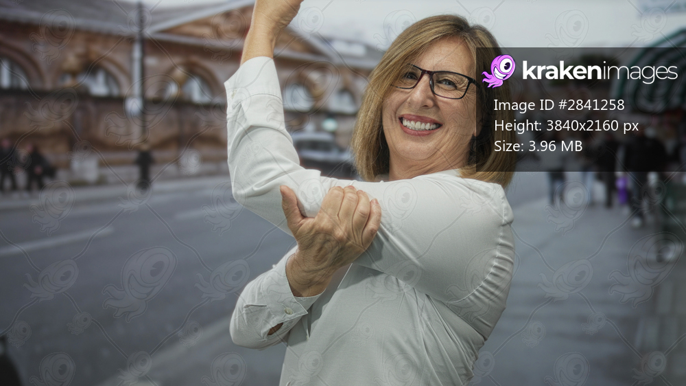 Middle aged caucasian woman in white shirt flexes arm on city street past blurred buildings and people; confidence empowerment.