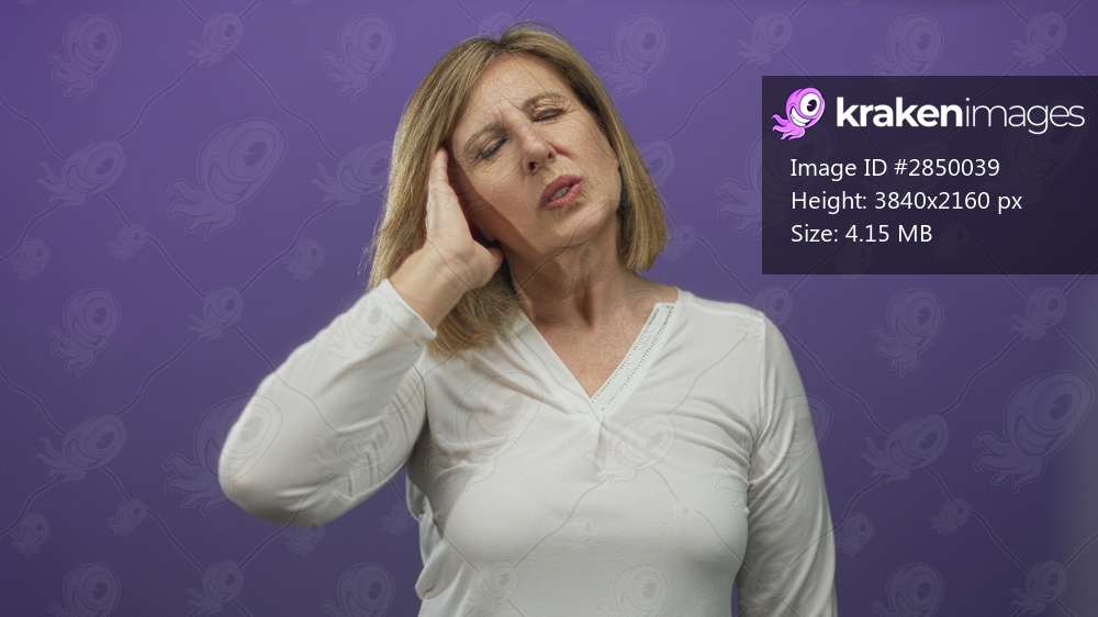 Middle aged caucasian woman in white shirt grimaces and turns head upward with hand on neck in studio; discomfort.